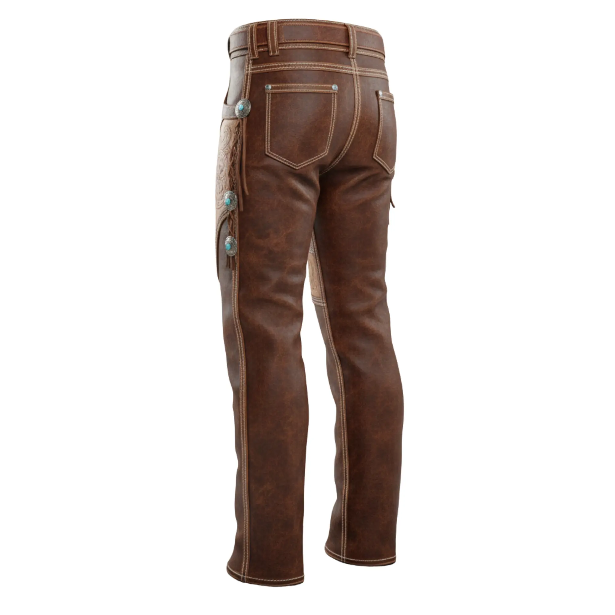 The pinnacle of Western craftsmanship. Our Custom American-Style Leather Pants are designed for those who demand more than just a look—they demand a legacy. Merging the rugged durability required for the saddle with the refined aesthetics of high-end fashion, these pants feature intricate, hand-carved floral overlays and genuine turquoise-accented conchos.