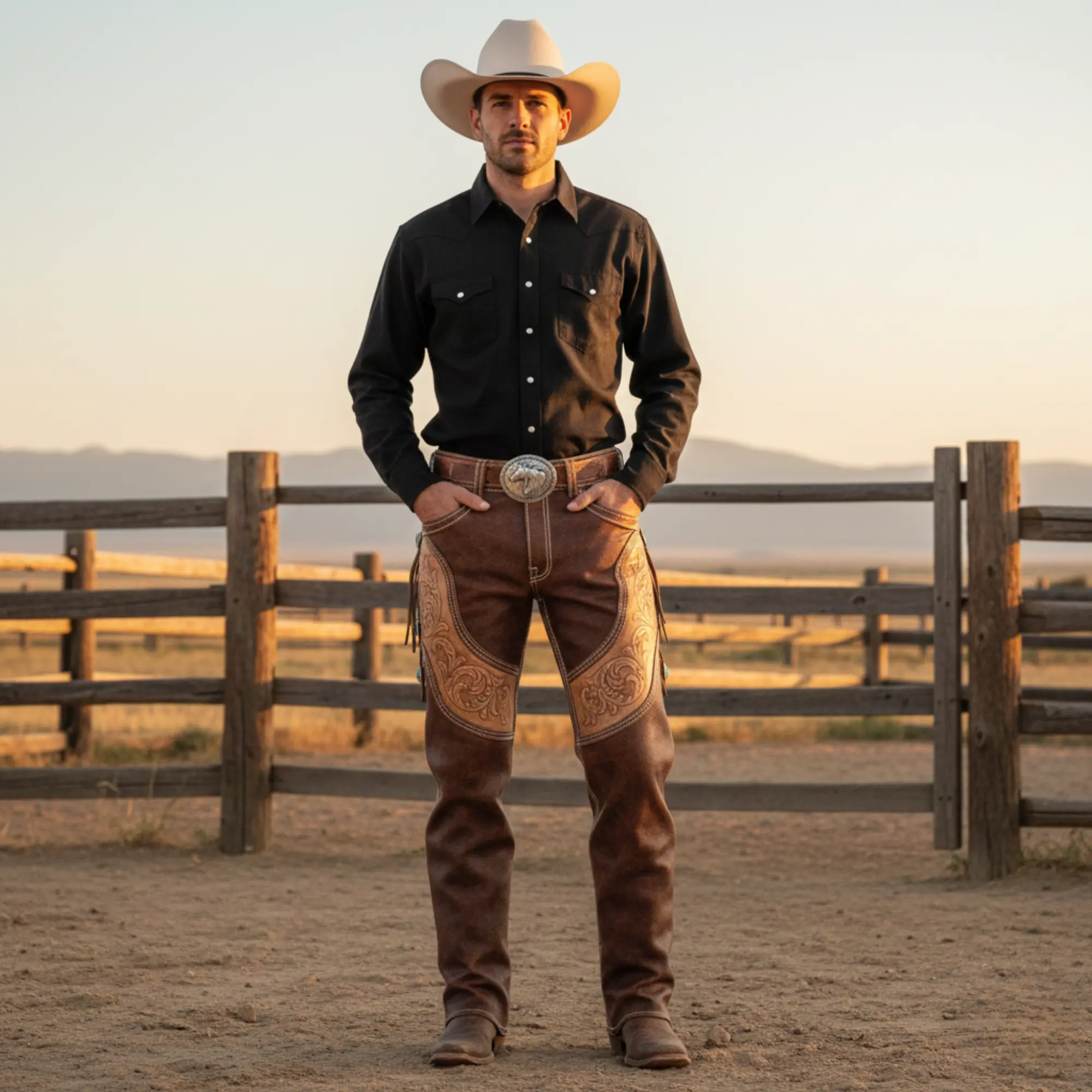 Artisanal Tooling: Traditional hand-carved floral patterns on the thighs and pockets for an authentic “Old West” aesthetic.